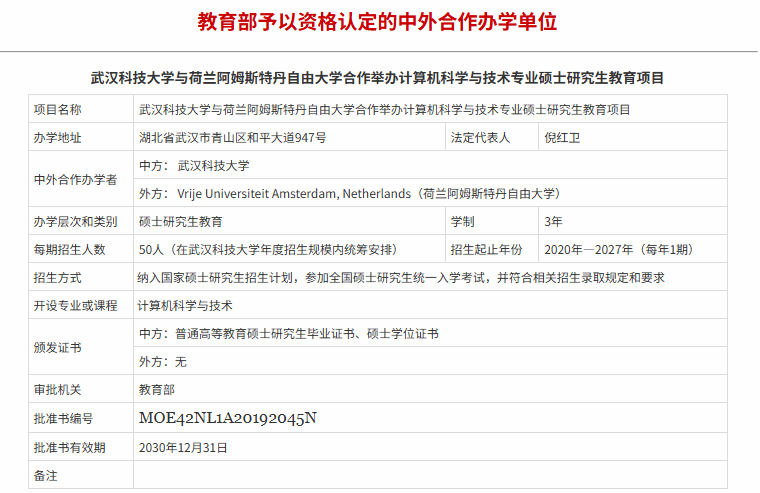 武汉科技大学与荷兰阿姆斯特丹自由大学合作举办计算机科学与技术专业硕士研究生教育项目