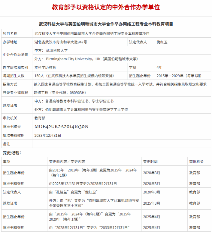 武汉科技大学与英国伯明翰城市大学合作项目获批延期及变更为双学位项目